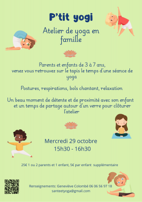 Parents et enfants de 3 à 7 ans,venez vous retrouvez sur le tapis le temps d’une séance de yoga. Découvre les bienfaits du yoga pour les grands comme pour les petits.